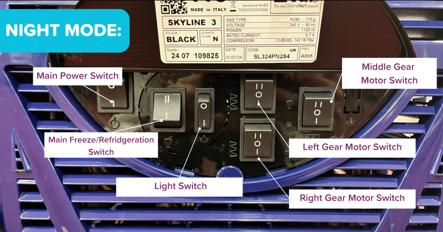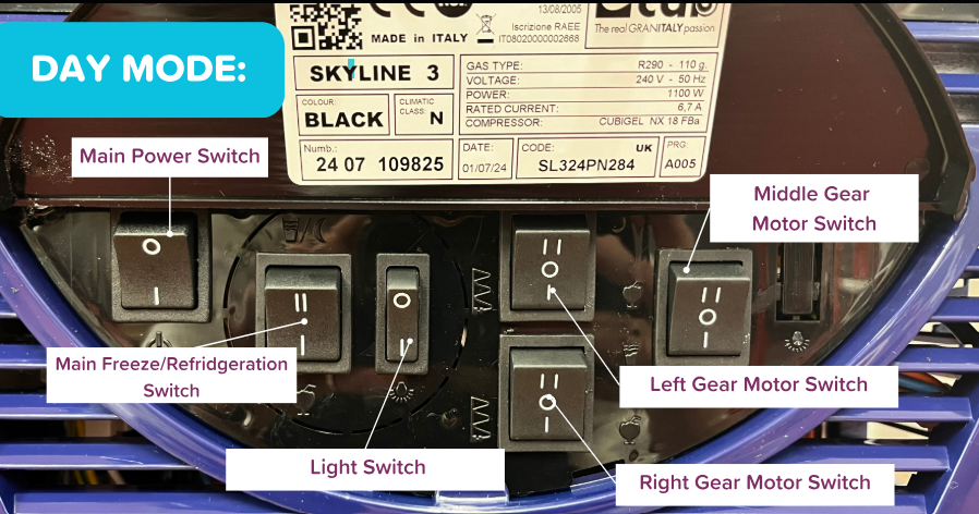 Click the Main Refrigeration Switch upwards to the position shown in the images. This puts the unit into a chilled, non-freezing state.